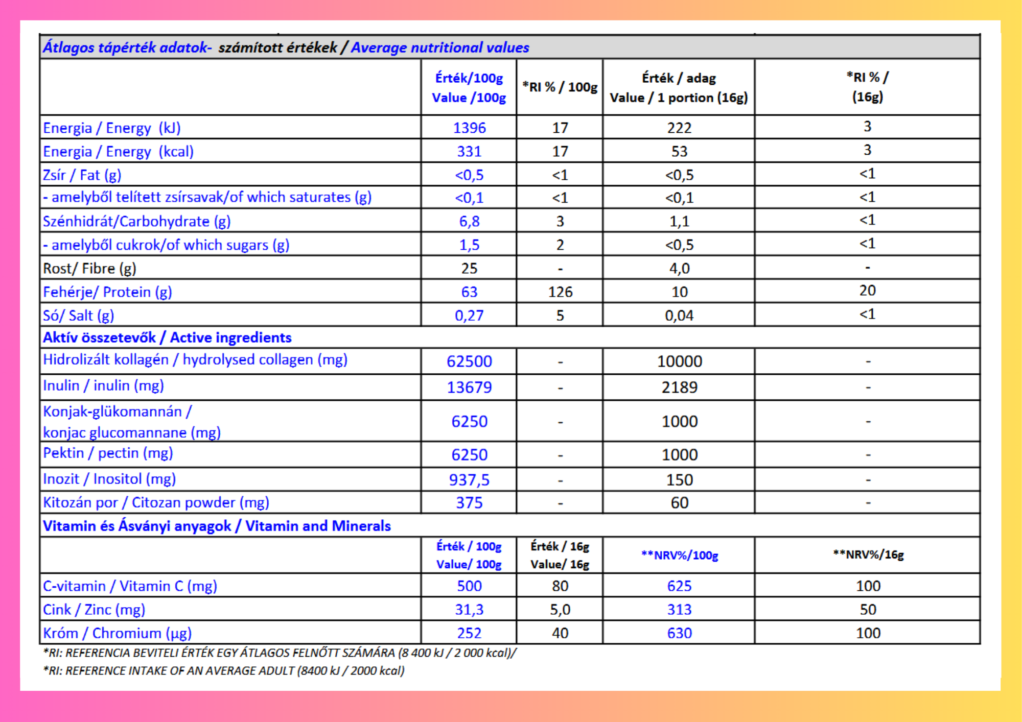 Hidrolizált marhakollagén, rostkomplex [inulin, konjak-glükomannán, pektin], aromák, sűrítőanyagok (xantángumi, karragén), inozit (mio-inozit), C-vitamin (L-aszkorbinsav), kitozán por (rákfélékből), édesítőszer (szukralóz), étkezési só, ásványi anyagok (cink: cink-biszglicinát, króm (króm(III)-pikolinát), vaníliamag, színezék (karotinok).
