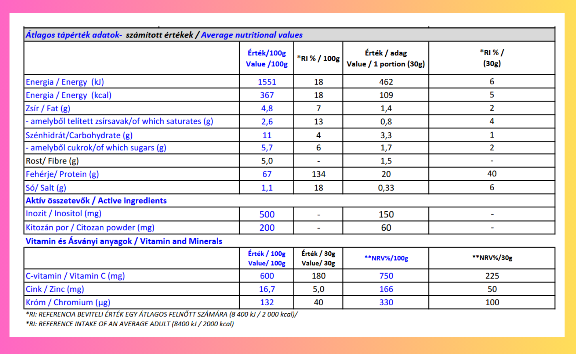 Fehérje mátrix [csökkentett laktóztartalmú tejsavófehérje koncentrátum, napraforgómag fehérje, lenmagfehérje, tejsavófehérje izolátum (emulgeálószer: napraforgólecitin), micelláris kazein (tejből)], aromák, koffeinmentes instant kávé (2,5%), sűrítőanyagok (karragén, xantángumi), 2,5% rostkomplex [konjak-glükomannán, inulin], C-vitamin (L-aszkorbinsav), étkezési (Himalája) só, inozit (mio-inozit), színezék (szulfitos-ammóniás karamell), szőlőmag őrlemény, édesítőszer (szukralóz), kitozán por (rákfélékből), ásványi anyagok (cink: cink-biszglicinát, króm (króm(III)-pikolinát), laktáz enzim