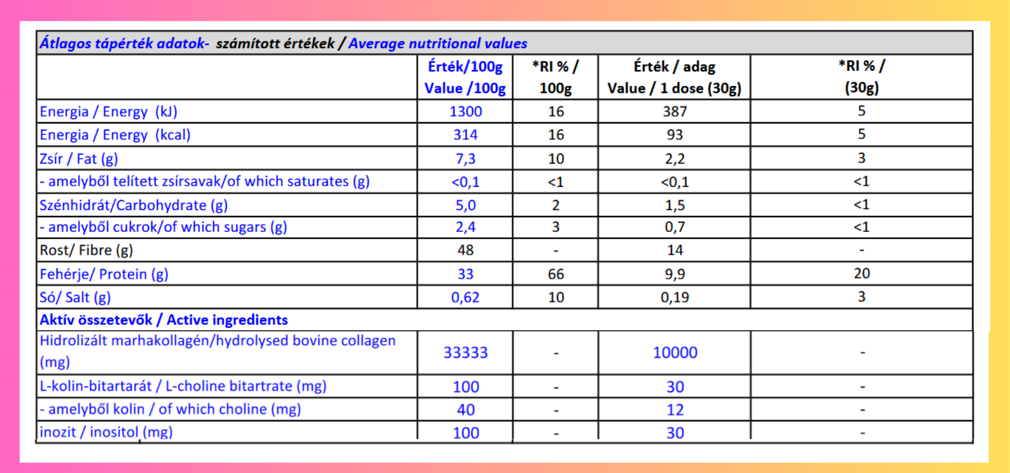 50,24% rostkomplex (inulin, bambuszrost, gluténmentes zabrost, pektin, konjak-glükomannán, útifűmaghéjliszt), hidrolizált marhakollagén, MCT (közepes szénláncú zsírsavak) olajpor [MCT olajpor (kókuszolajból), gumiarábikum, csomósodást gátló anyag (szilícium-dioxid)], aromák, meggypor, színező élelmiszer (céklakoncentrátum), étkezési só, édesítőszerek (szukralóz, aceszulfám-K), vitaminok (biotin: D-biotin, folsav: pteroilmonoglutaminsav), vitamin premix (C-vitamin: L-aszkorbinsav, niacin: nikotinamid, E-vitamin: DL-alfa-tokoferil-acetát, pantoténsav: kalcium-D-pantotenát, B6-vitamin: piridoxin-hidroklorid, B2-
