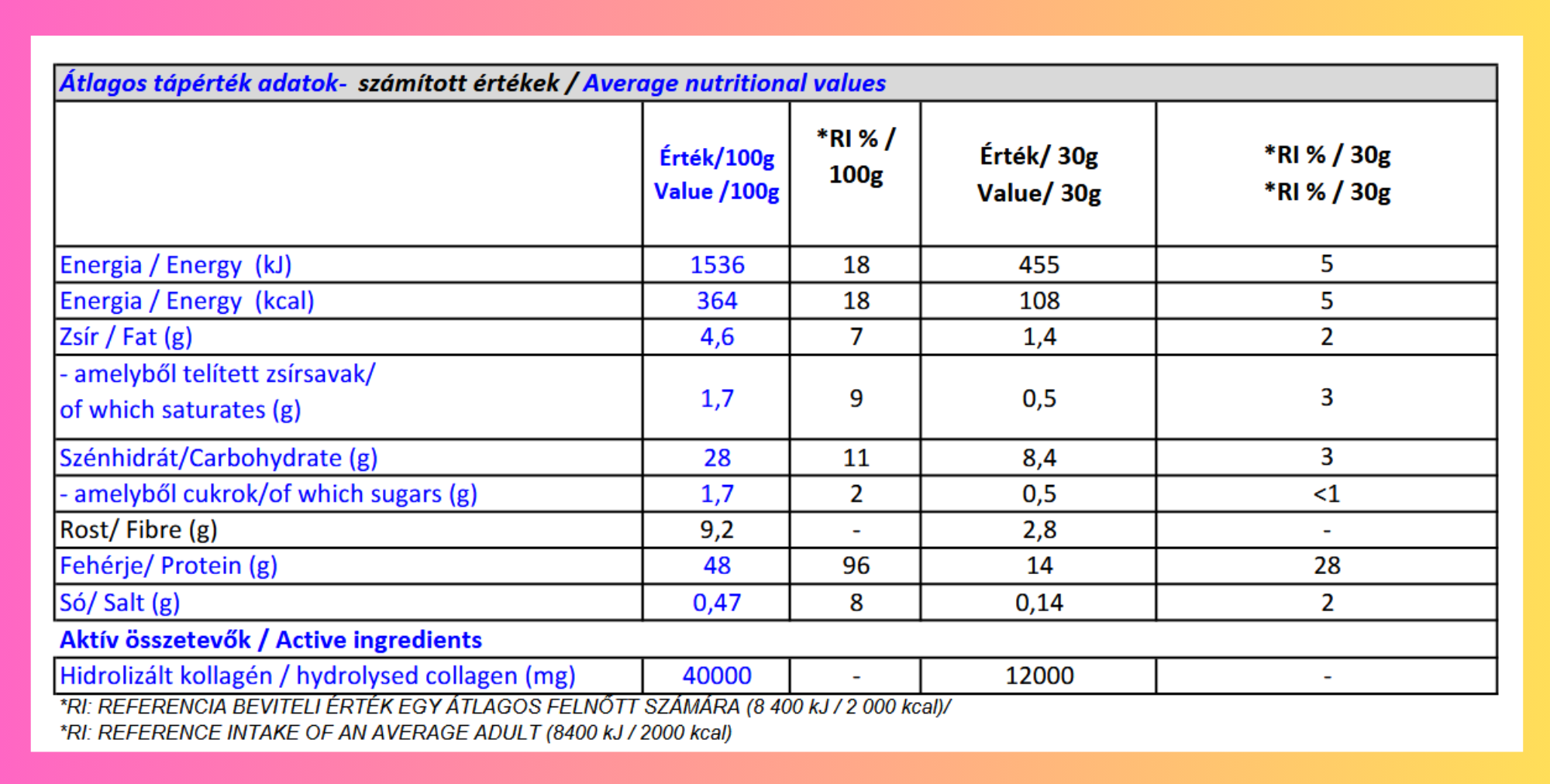 Gluténmentes teljes kiőrlésű zabpehelyliszt, hidrolizált marhakollagén, kakaópor, aromák, étkezési (himalája) só, édesítős